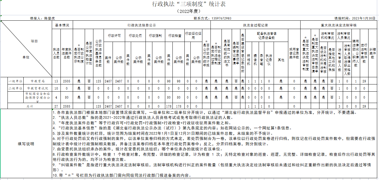 1.各市直执法部门根据本地部门设置情况据实填写,一级单位和二级单位分开统计,以通过“湖北省行政执法监督平台”申报通过的单位为准,分开统计,不要遗漏。